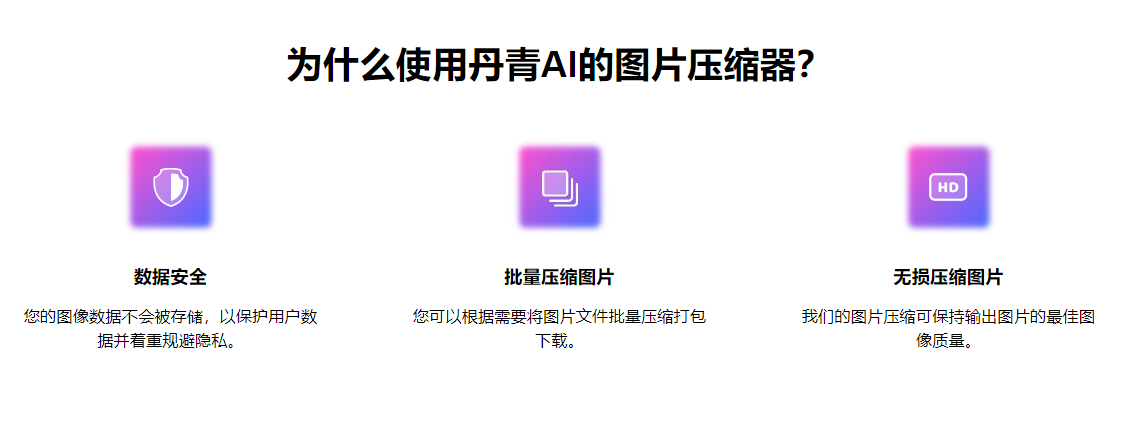 此外,丹青AI還提供了批量壓縮、格式轉(zhuǎn)換等實用功能,為用戶節(jié)省了大量的時間和精力。無論您是設(shè)計師、攝影師,還是普通的網(wǎng)絡(luò)用戶,都可以從丹青AI的圖片壓縮服務(wù)中受益。