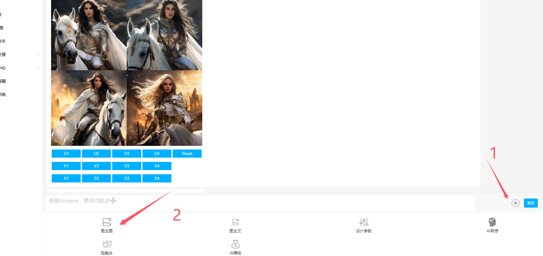 第一步、打開丹青AI繪畫的MJ繪畫功能,在提示詞輸入框發(fā)送按鈕旁的“+”號(hào)位置打開下拉功能后選擇“圖生圖”;