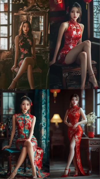 提示詞:Beautiful Chinese woman, cheongsam, long legs, charming. Medium Shot --ar 9:16 (