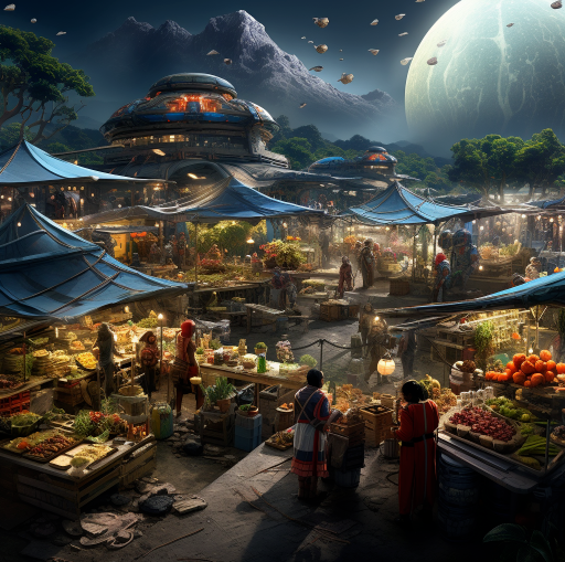 **Prompt:**An alien marketplace bustling with activity. Various extraterrestrial species are trading exotic goods. Stalls are filled with unknown fruits, alien gadgets, and rare metals.