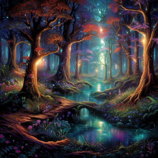 **Prompt:**Visualize an enchanted forest at dawn. The trees have twisted trunks and leaves that shimmer with iridescent colors. Fairies are flying around, and a sparkling river flows through the heart of the forest.