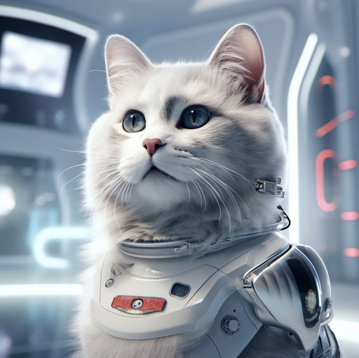 (highest quality), masterpiece, intricate, high detail, professional photo, 8k uhd, sharp focus, (realistic photograph:1.2), (half a cat, half a futuristic cyborg white porcelain AI cat, in a vrtual high tech environment:1.2), bright environment
