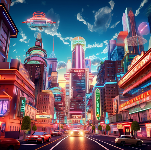 **Prompt:**A cityscape blending the architectural styles of the 1950s with futuristic elements. Flying cars zoom past towering skyscrapers with neon signs, while monorails weave between the buildings.