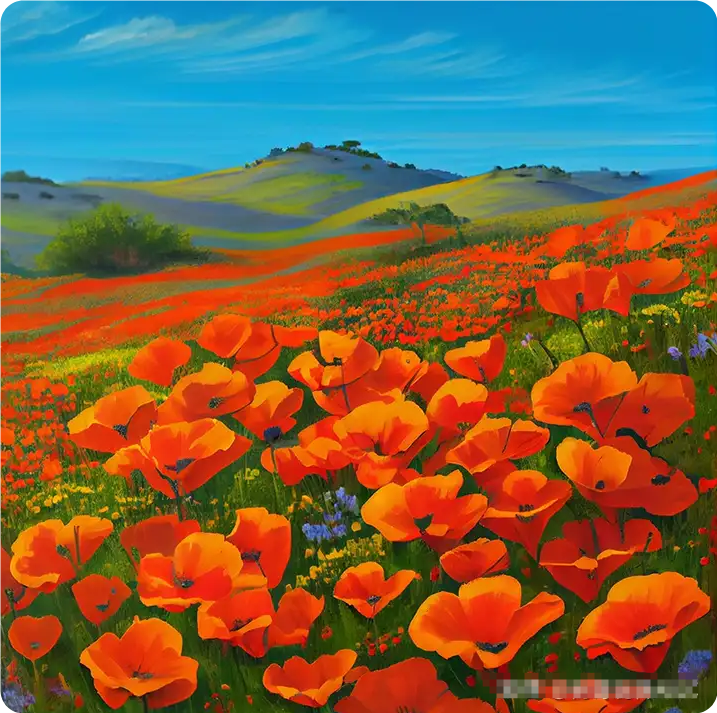 關(guān)鍵詞:Show me a picture of lots of blooming California poppies, make them bright, vibrant orange, and draw them in an illustrated style with colored pencils
