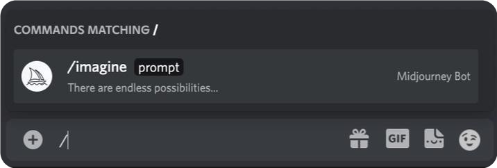 從斜杠命令彈出窗口中鍵入/imagine prompt:或選擇命令。/imagine