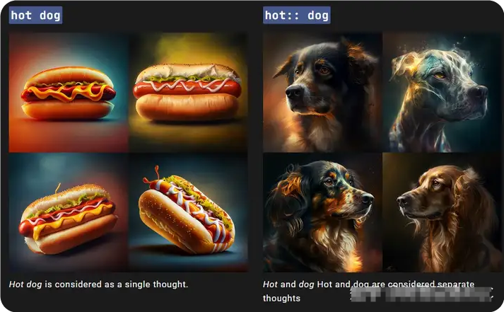 如果將提示分成兩部分,hot:: dog則將兩個概念分開考慮,從而創(chuàng)建溫暖的狗的圖片。