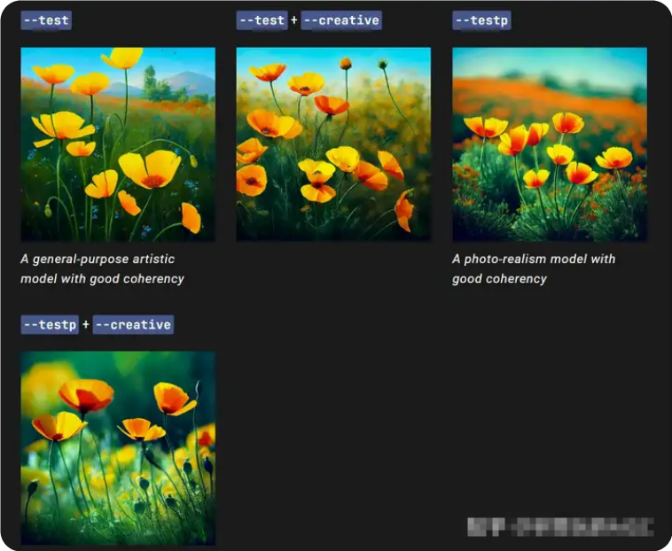 偶爾會臨時發(fā)布新模型以供社區(qū)測試和反饋。目前有兩種可用的測試模型:--test和--testp,它們可以與--creative參數(shù)結(jié)合使用以獲得更多不同的成分。