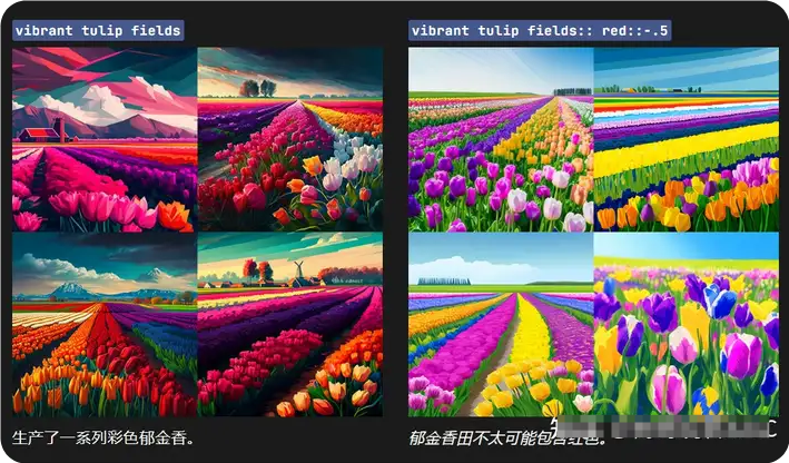 參數(shù)--no 與權(quán)重部分相同,多提示“-.5”與vibrant tulip fields:: red::-.5相同vibrant tulip fields --no red。
