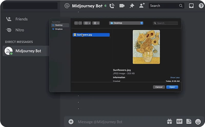 要將個人圖片用作提示的一部分,請將其上傳到 Discord。要上傳圖像,請單擊消息鍵入位置旁邊的加號。選擇上傳文件,選擇圖像,然后發(fā)送消息。