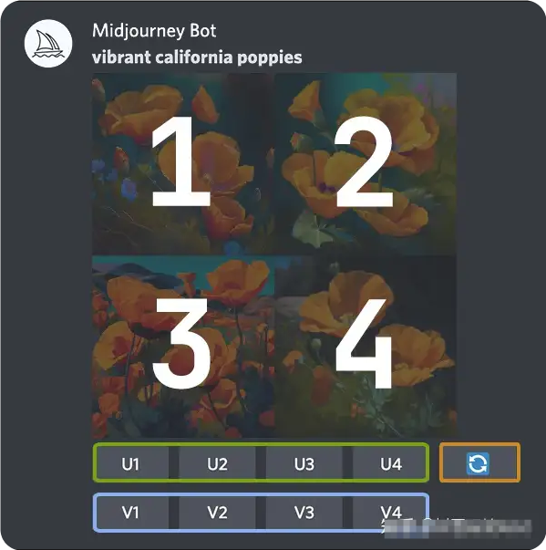 V1 V2 V3 V4 V 按鈕創(chuàng)建所選網(wǎng)格圖像的細(xì)微變化。創(chuàng)建變體會生成與所選圖像的整體風(fēng)格和構(gòu)圖相似的新圖像網(wǎng)格。