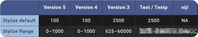測試模型僅支持--stylize1250–5000 之間的值。