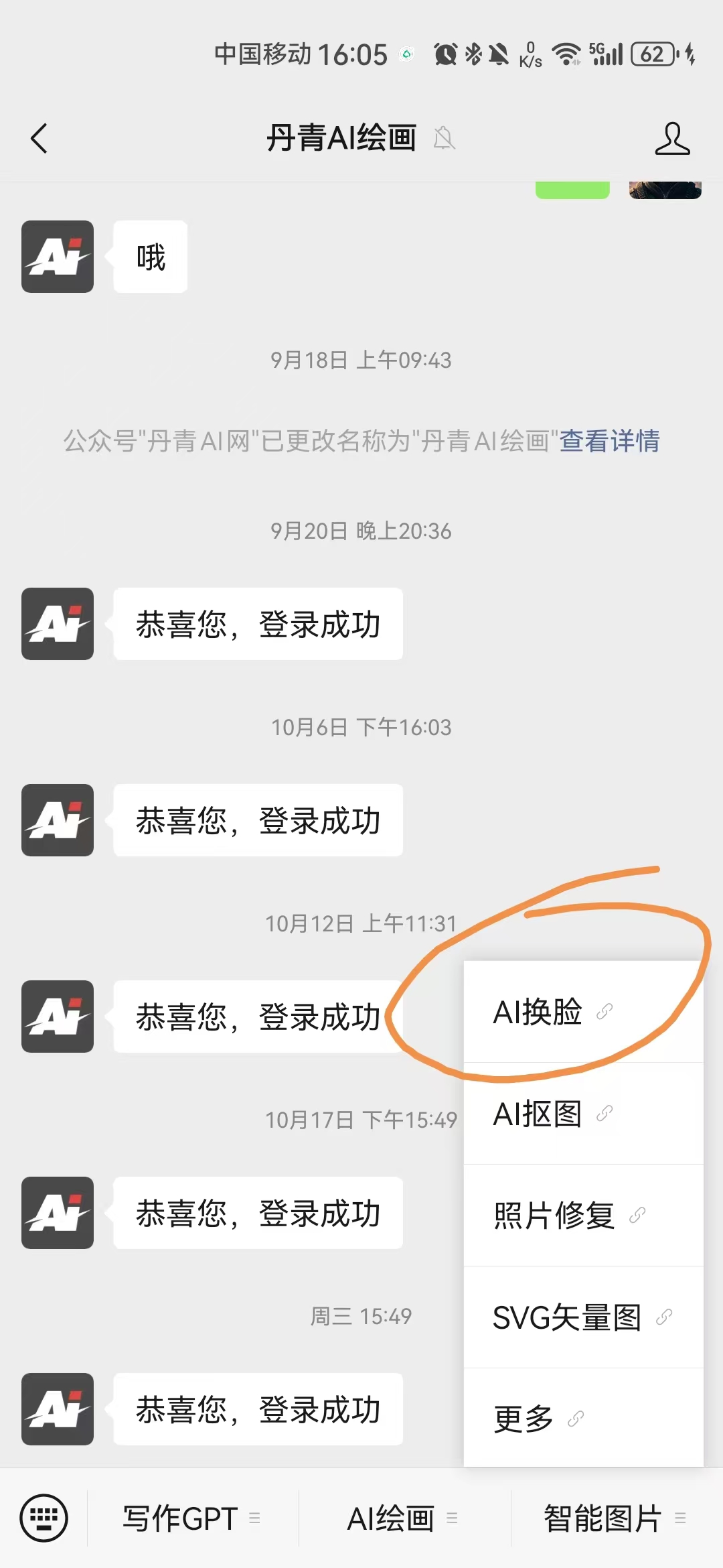 移動(dòng)手機(jī)端用戶打開丹青ai繪畫網(wǎng)站登錄后會(huì)跳轉(zhuǎn)到“丹青AI繪畫”公眾號(hào)里面,如下圖所示點(diǎn)擊右下角圖片處理中的選項(xiàng)進(jìn)入“AI換臉”功能頁面(之所以跳轉(zhuǎn)到公眾號(hào)是解決用戶端面注冊登錄,使用更方便?。?br />