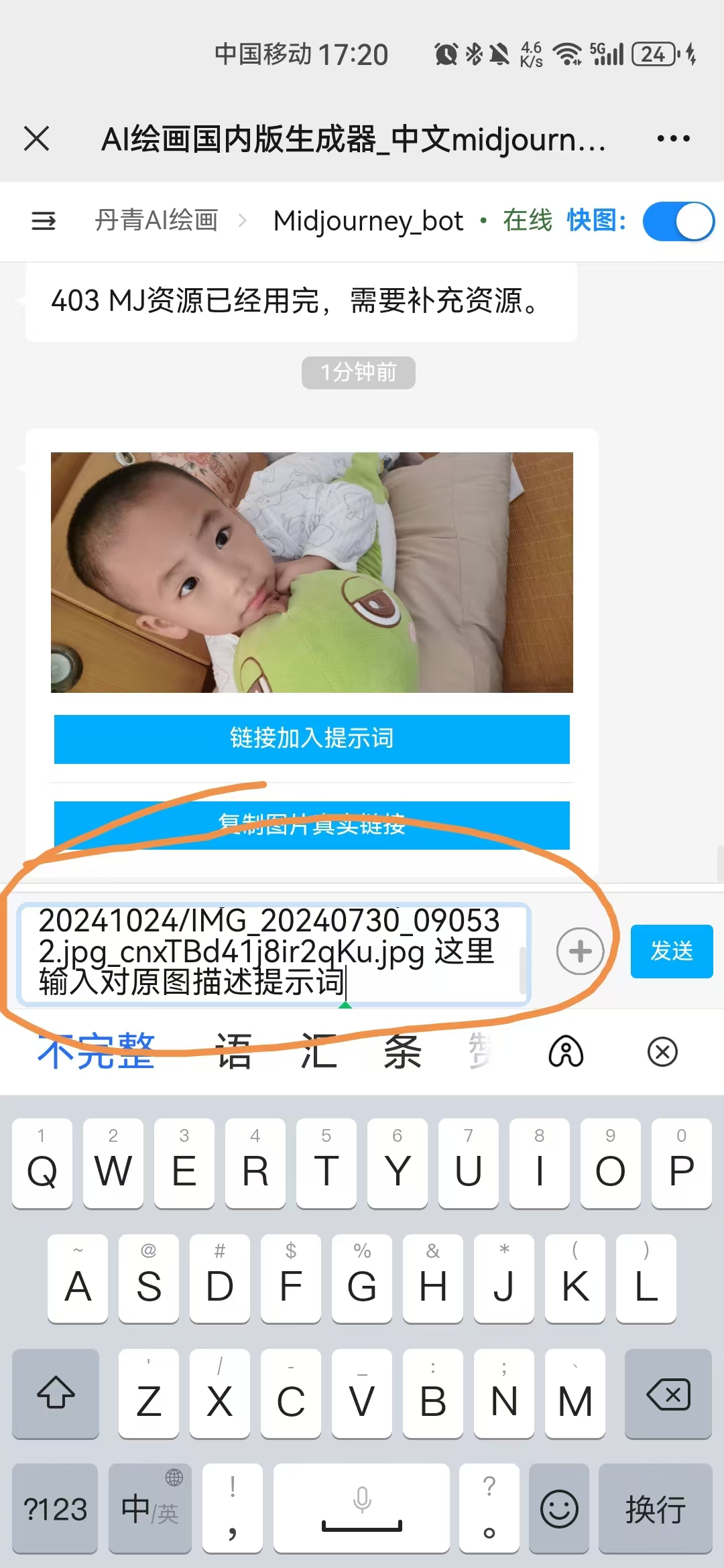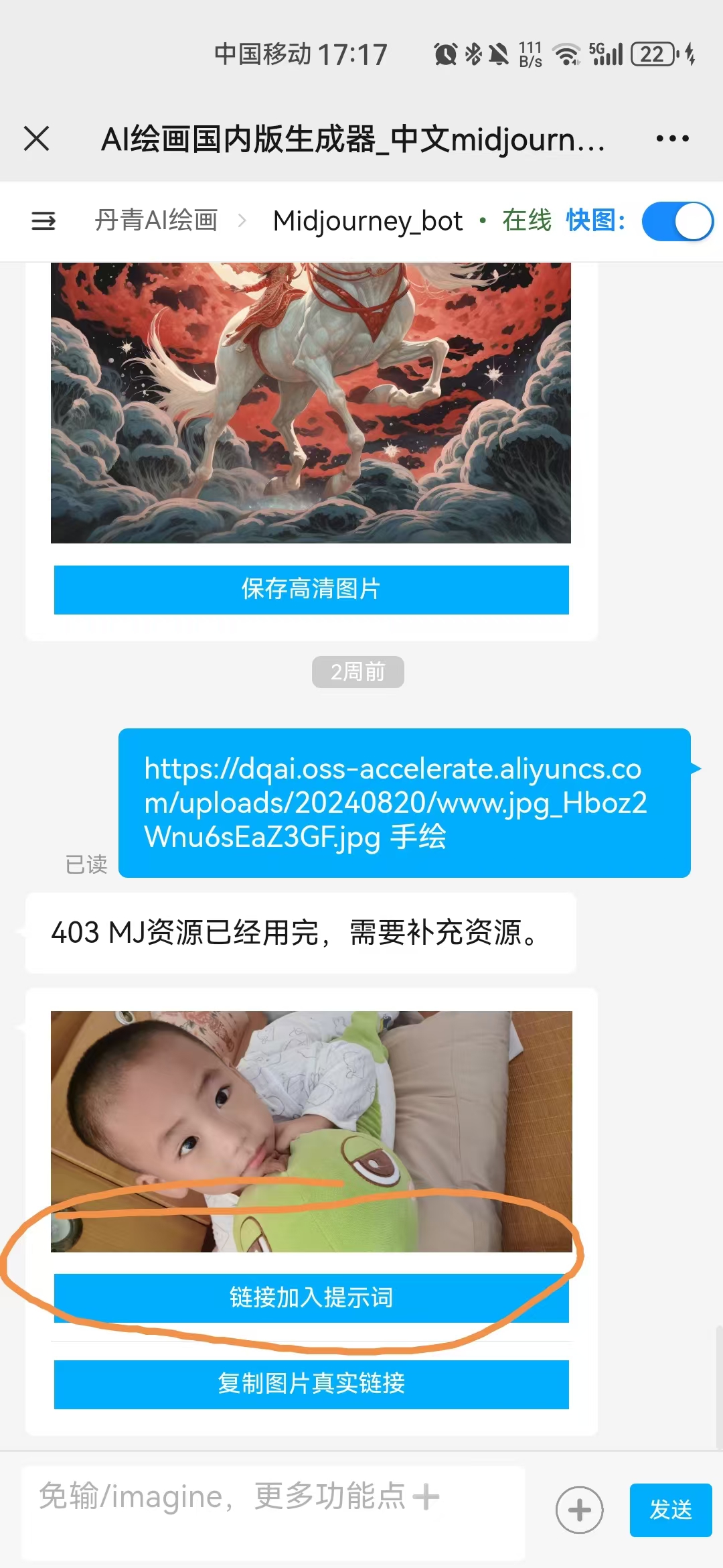 上傳圖片后,我們再次點擊圖片下方的“鏈接加入提示詞”,然后觀察提示詞輸入窗口就是切換為帶圖片地址的前綴;
