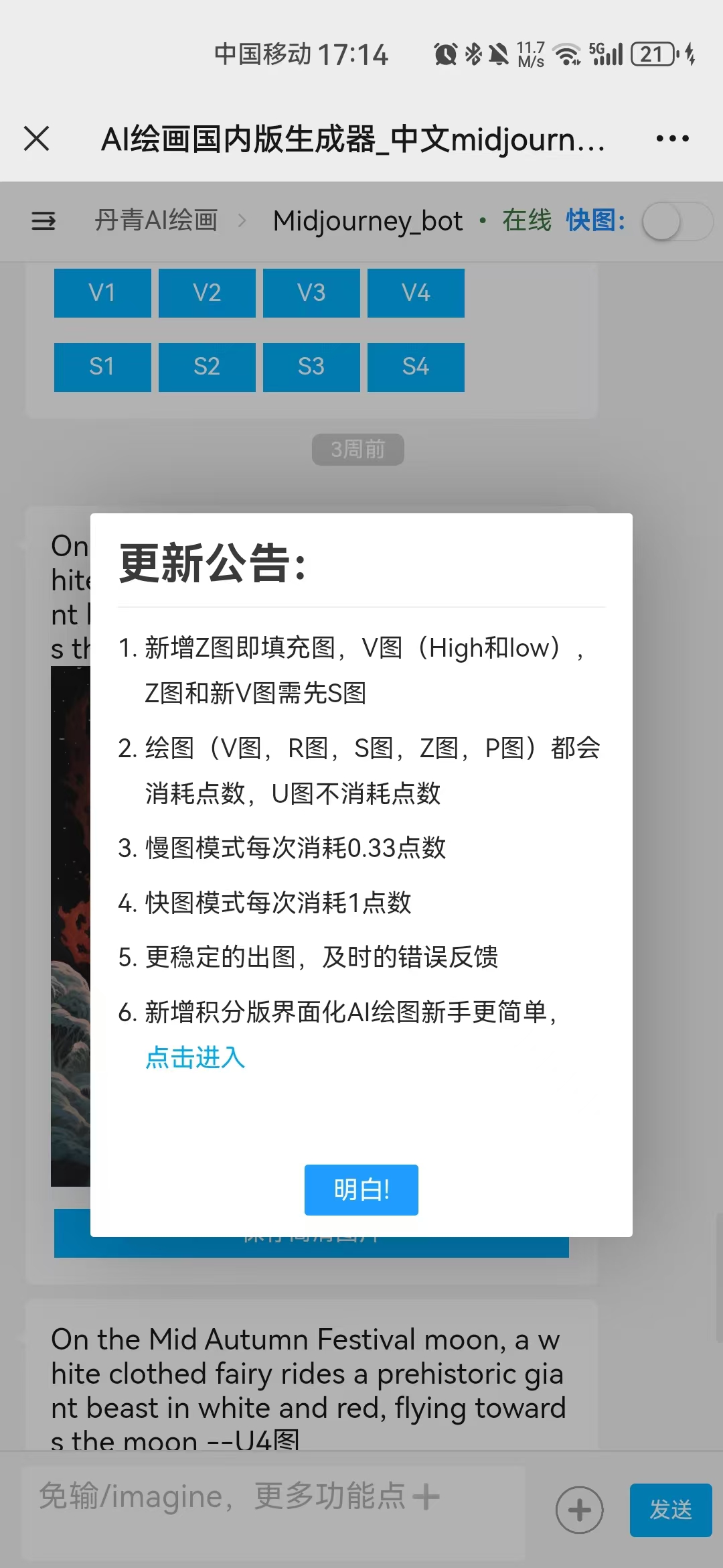 進入midjourney繪畫頁面后如下圖所示,這里會首先彈出一個提示公告,其中一項就是面向新手用戶的積分界面版的ai繪畫入口,如果是菜鳥級用戶則可以切換過去;