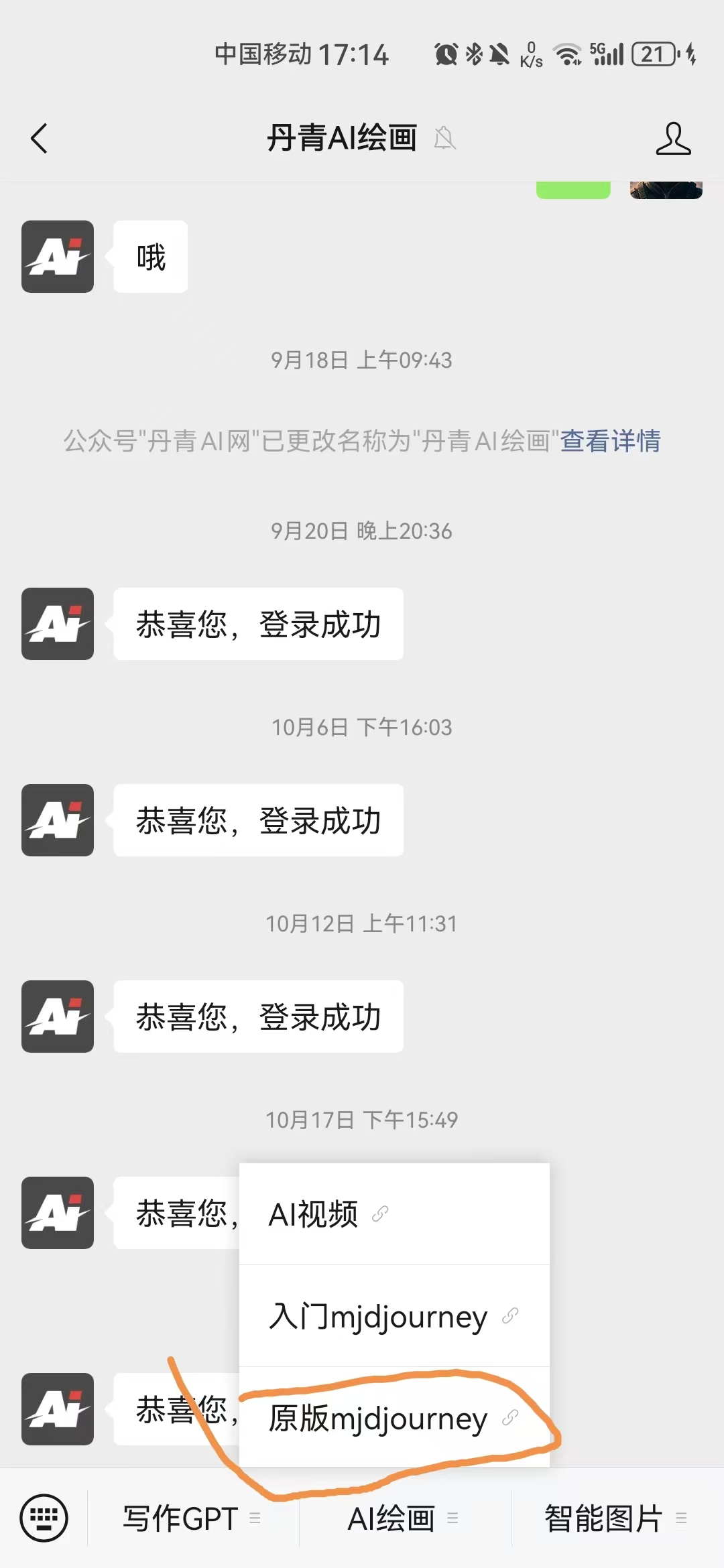 這一期我們做的是丹青ai繪畫網(wǎng)站的移動手機端的操作教程,為了方便手機端用戶免注冊使用,移動設(shè)計的用戶登錄后跳轉(zhuǎn)到我們“丹青AI繪畫”官方公眾號內(nèi)使用,如下圖所示我們只需要點擊導航欄上的Midjourney繪畫頁面入口即可;