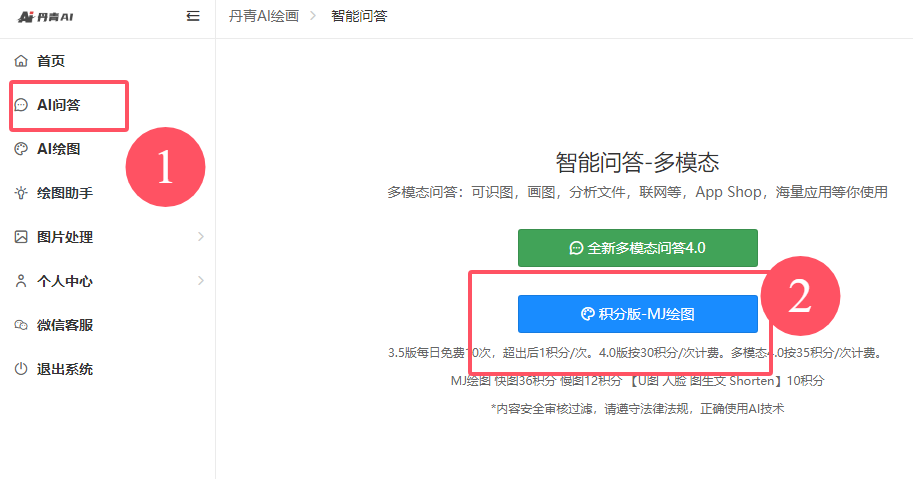 Midjourney局部重繪我們是放在積分版-MJ繪圖版塊里面,需要使用的朋友可以如下圖所示點擊導(dǎo)航功能“AI問答”頁面選擇進(jìn)入;