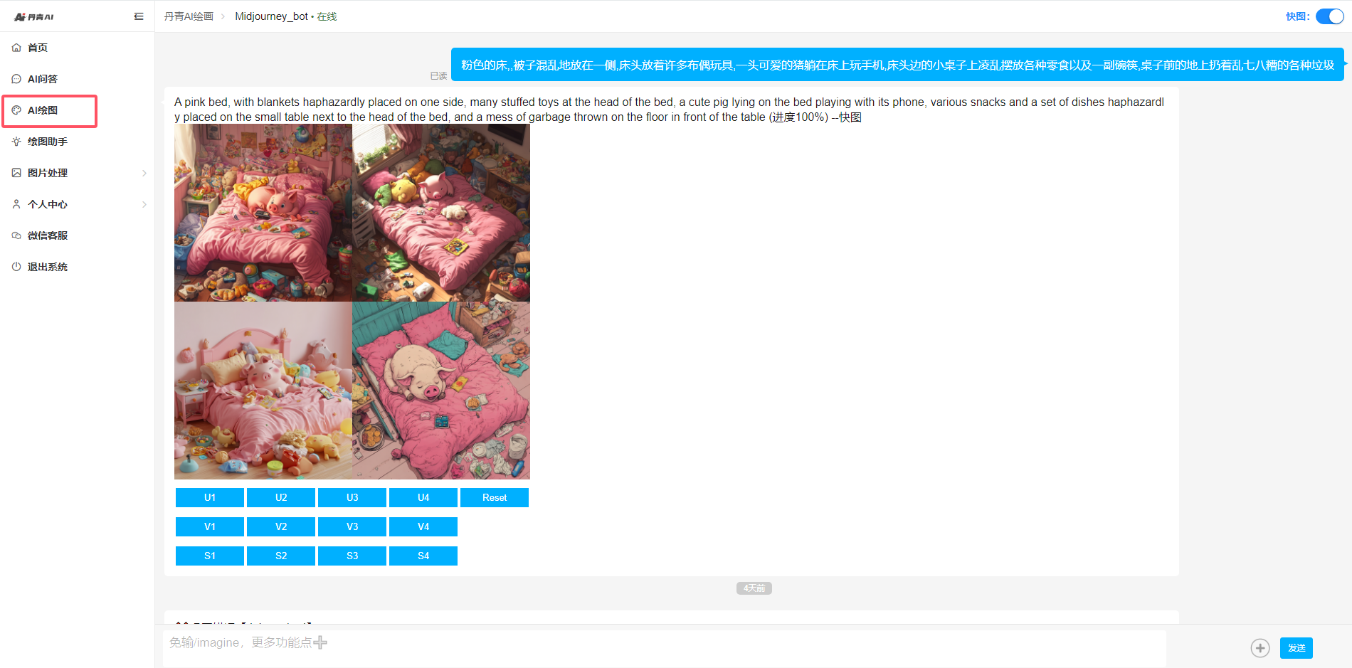 原版Midjunery繪畫下圖所示是我們丹青ai繪畫提供的原版midjunery的操作界面,且支持純中文直接輸入提示詞,不需要懵逼的英文可以直接將想要的繪圖需求直接提交Midjunery機(jī)器人,即可在線返回ai繪圖生成圖片,支持U圖、V圖、S圖以及圖生圖、圖生文。