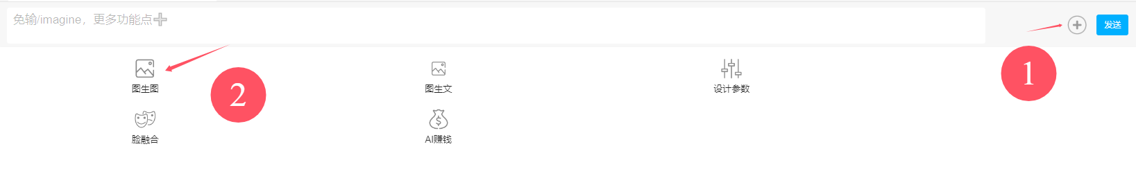 其中圖生圖則點(diǎn)擊發(fā)送按鈕旁邊的“+”號,然后可以在下拉的功能菜單最左側(cè)如下圖標(biāo)注2所示的圖生圖上傳本地圖片