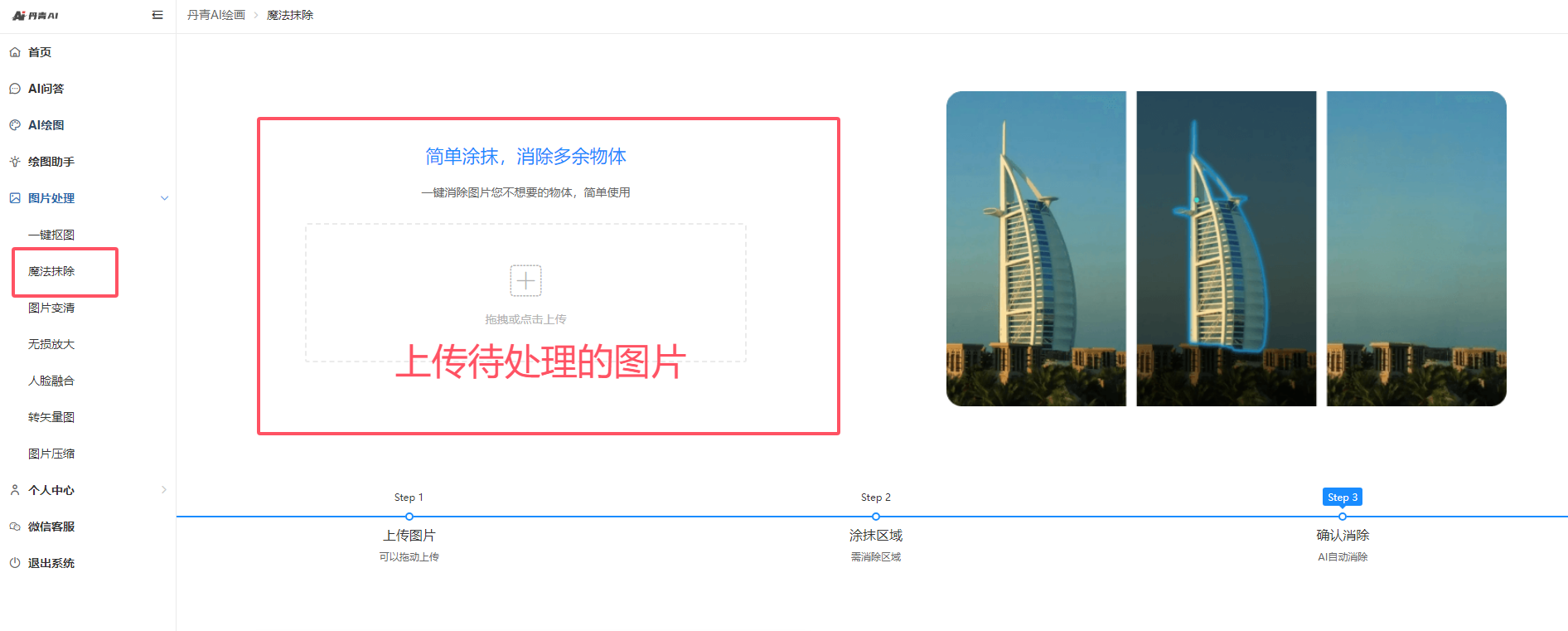 丹青ai消除是非常使用的一個小功能,它可以幫我們將圖片畫面上不需要的物體、人物、汽車、動物等多余不需要的元素單獨抹除而不影響整個畫面的完整性。在如下圖所示的就是ai消除軟件的網(wǎng)頁版界面,通過導航中的“魔法抹除”即可找到圖片上傳的入口。
