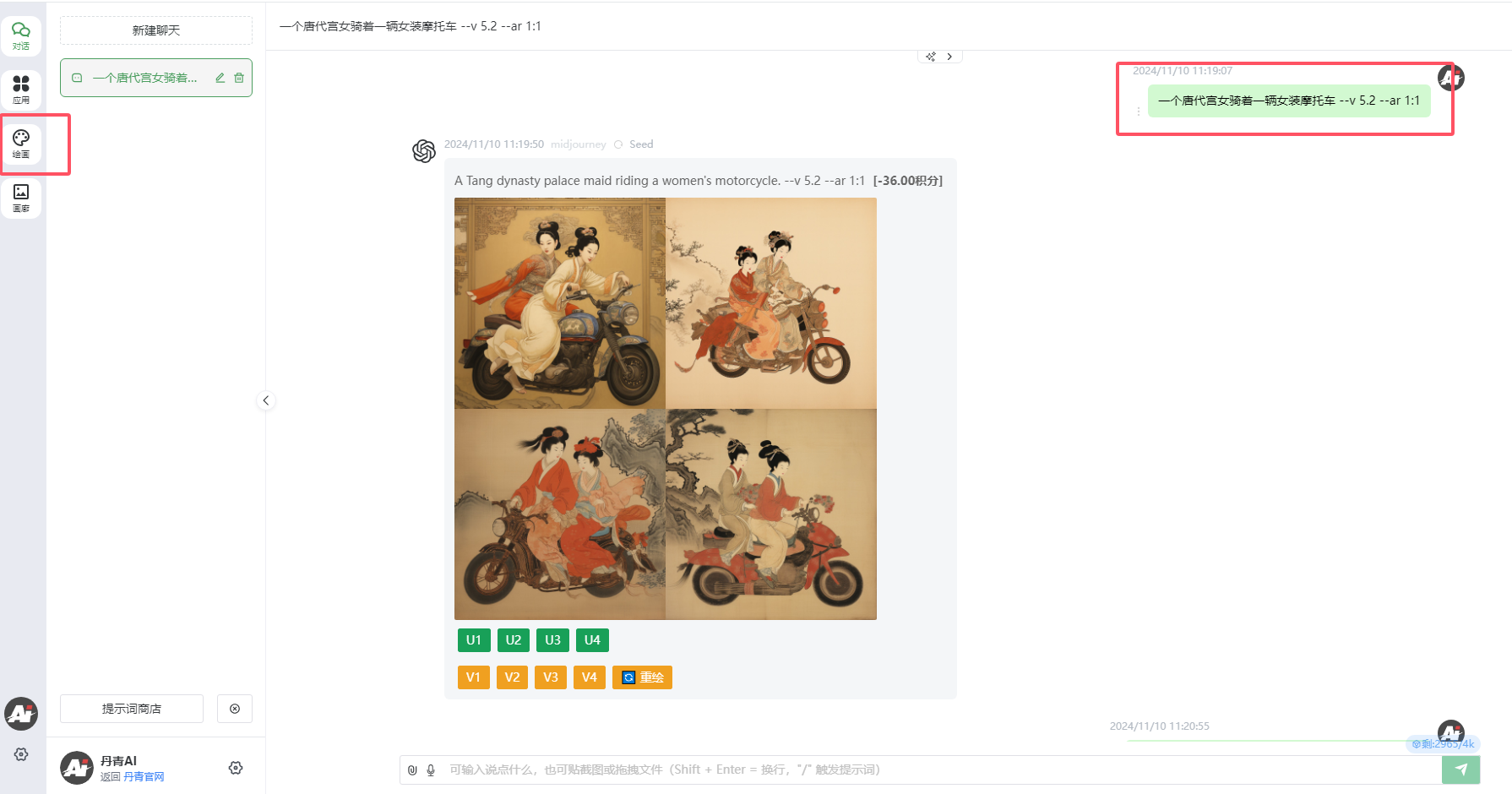 然后丹青ai繪畫網(wǎng)頁(yè)版將自動(dòng)生成四張Midjourney繪圖反饋,如下圖所示。這里我們只是做一下ai繪圖的演示教程,所以提示詞比較簡(jiǎn)單生成的繪圖也是相對(duì)粗糙一點(diǎn)的,對(duì)與深層次的畫質(zhì)Midjourney還是毋容置疑的,大家放心使用。