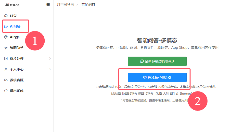 第一步,先在網(wǎng)站的功能導(dǎo)航上選擇點(diǎn)擊“ai問(wèn)答”,然后在圖示2步驟中點(diǎn)擊“積分版-MJ繪圖”進(jìn)入新手版