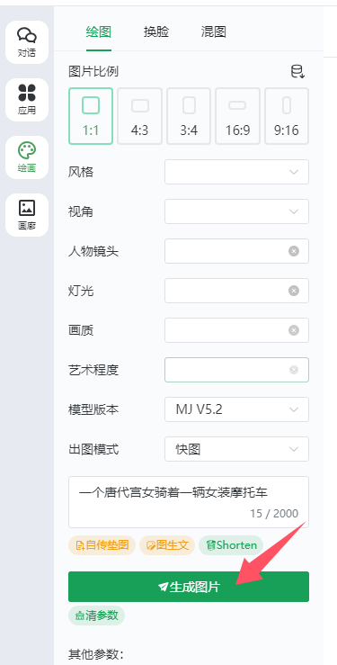 我們可以直接在輸入框“一個(gè)唐代宮女騎著一輛女裝摩托車”,點(diǎn)擊提交發(fā)送即可一鍵生成ai繪畫。針對(duì)初學(xué)新手用戶這里都是界面化的操作,可以根據(jù)自己的繪畫需求選擇一些產(chǎn)數(shù),都是很直觀的了。