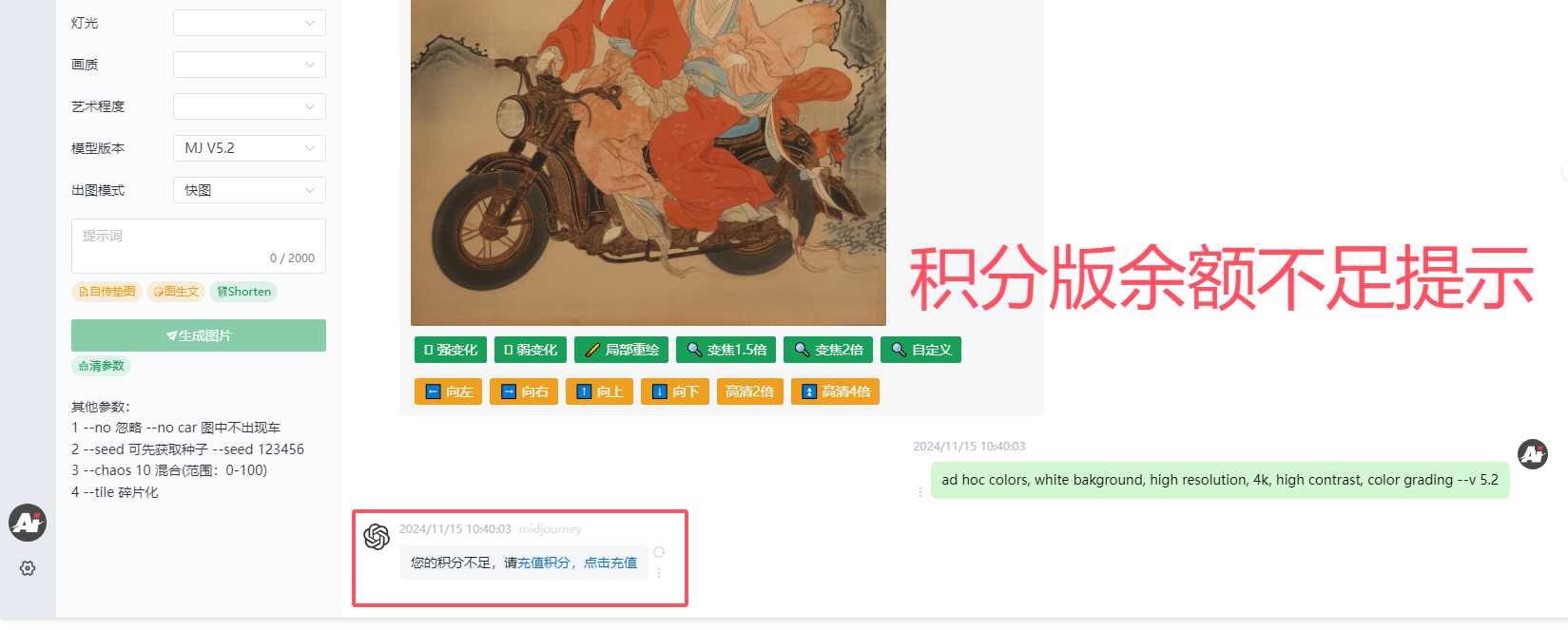 丹青ai繪畫網(wǎng)站上的midjourney繪畫都是付費(fèi)應(yīng)用(官方都沒有免費(fèi)的東西,白嫖黨請(qǐng)出門左轉(zhuǎn)),提供積分版和點(diǎn)數(shù)兩種充值方式,對(duì)應(yīng)的是界面積分版的MJ繪圖和原版ai繪圖功能,用戶在充值前請(qǐng)咨詢分辨使用方式選擇合適自己的充值模式。如果個(gè)人賬戶余額不足繪圖的情況下將分別出現(xiàn)以下兩種相應(yīng)的錯(cuò)誤提示。