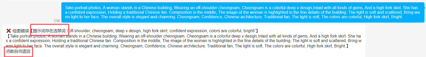 提示詞中出現(xiàn)違禁詞匯比如:裸體、露乳、彩票以及政治方面的一切有違法律、道德等公俗良知的描述,丹青ai繪畫網(wǎng)站一律不予生成,同時(shí)返回相應(yīng)的點(diǎn)數(shù),出現(xiàn)這種錯(cuò)誤提示請(qǐng)仔細(xì)斟酌提示詞描述內(nèi)容后再次發(fā)送生成繪圖即可。