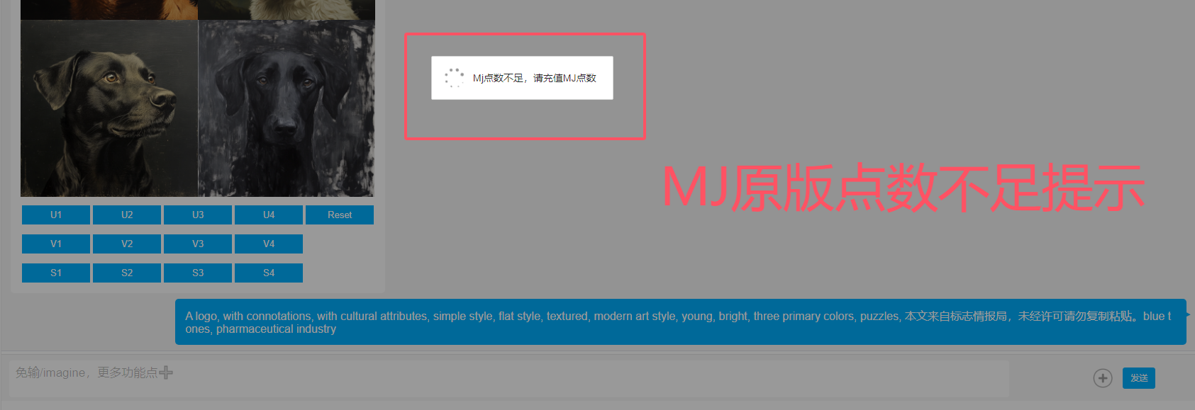 4、Midjourney賬戶余額不足導(dǎo)致的如下圖所示則是丹青ai繪畫網(wǎng)站本身的Midjourney資源不足,遇到此情況也是聯(lián)系我們?cè)诰€客服及時(shí)處理。