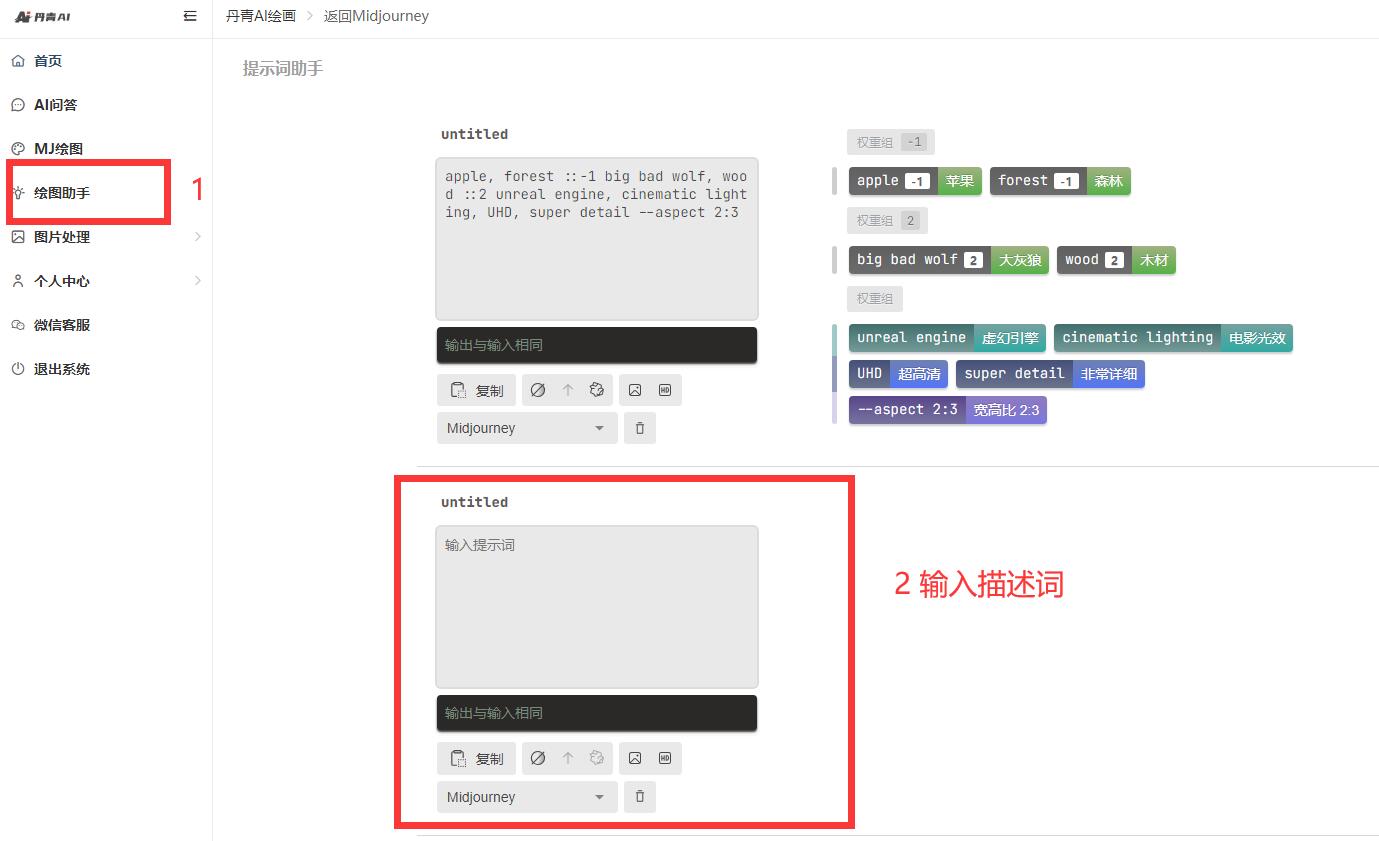 在丹青AI導(dǎo)航上面找到“繪圖助手”,然后在下圖位置2中輸入描述
