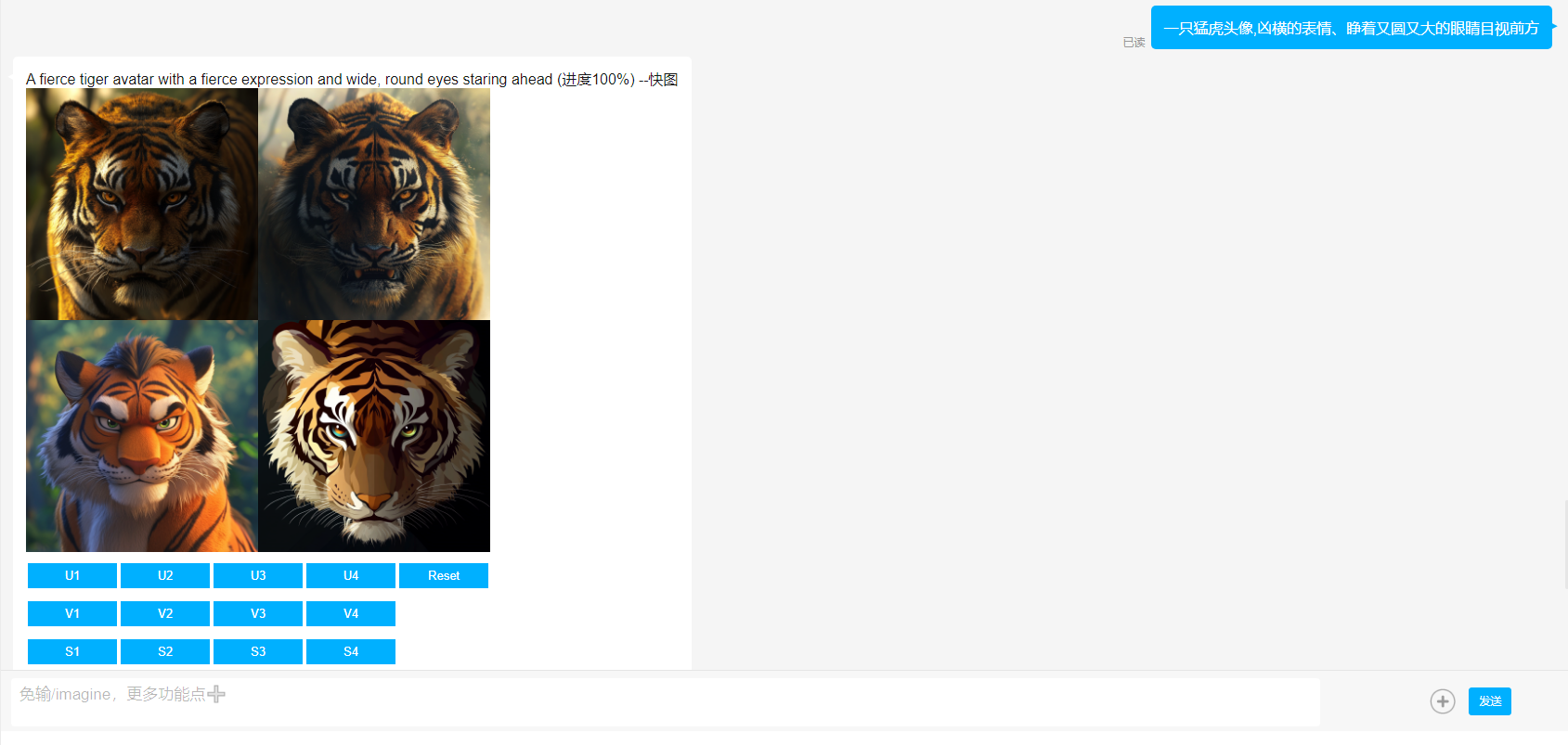 例如我們可以輸入“一只猛虎頭像,兇橫的表情、睜著又圓又大的眼睛目視前方”,看生成的效果有寫實和偏卡通的不同風(fēng)格,我們可以根據(jù)反饋的效果進(jìn)行U圖、V圖以及S圖等深層次的創(chuàng)作;