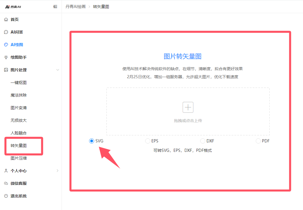 丹青ai繪畫官網(wǎng)不僅在繪畫方便提供強勁的功能,我們在只能圖片處理上也是非常突出的,其中包括人臉融合(ai變臉)、圖片變清、無損放大、ai轉換矢量圖等都是相當好用的。下面我們就來說說這個ai矢量圖生成工具的使用方法。