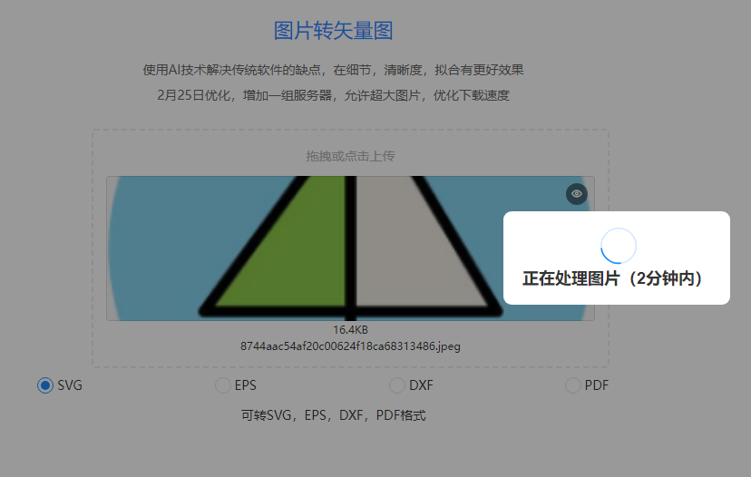 我們直接上傳的時候智能ai矢量圖轉換工具就自動轉換為svg格式了,無需任何操作全自動化處理,過程如下圖所示