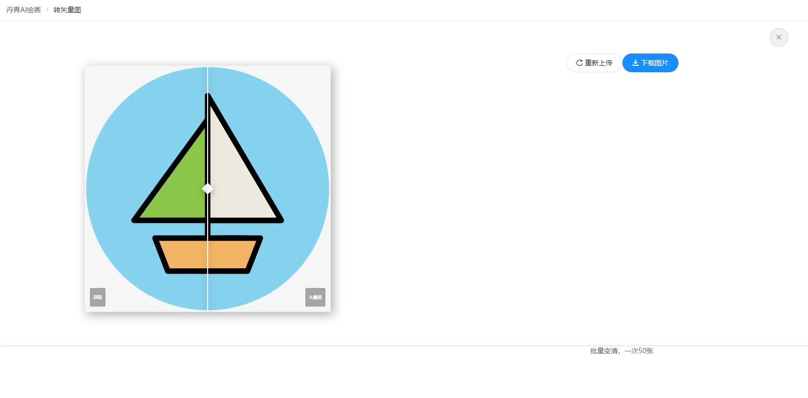 很快丹青ai就會出現(xiàn)如下圖所示的矢量圖生成完成界面,這里提供原圖和生成后的效果圖對比,沒問題的話我們只需要點擊右上角的“下載圖片”按鈕將ai轉換的矢量圖下載到本地使用即可。