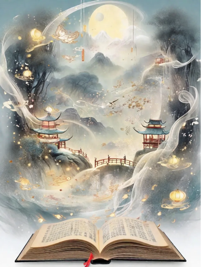2.書中奇妙世界The picture is grand, three-dimensional ancient style, with floating ink fonts on book pages, tiny figures, illusory world, flowing gauze, dreamlike, center glowing, infinite imagination, fairyland, glowing, sunlight refracted, semi transparent, virtual, charming light and shadow,畫面宏大,三維古風(fēng),書籍頁面飄動出字,水墨字體懸浮,極小的小人,虛幻世界,飄逸的薄紗,夢幻,中心發(fā)光,無限想象力,仙境,發(fā)光,陽光折射,半透明,虛擬,迷人光影