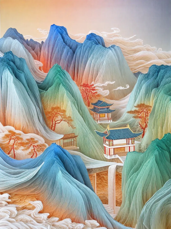 1.紙雕建筑Janet Echelman, 3D paper carving, semi transparent rice paper, sharp and smooth lines, Chinese landscape model, 3D, flowing straight down three thousand feet, blind box, strong top light irradiation, X-ray, Zen like, abstract, elegant and simple, clean background, Wang Ximeng, color gradient, stunning details Janet Echelman,立體紙雕,半透明宣紙,線條銳化,線條流暢,中式山水模型,3D,飛流直下三千尺,盲盒,強(qiáng)烈的頂光照射,x-ray,禪意,抽象,淡雅簡潔,干凈的背景,王希孟,顏色漸變,令人驚嘆的細(xì)節(jié)