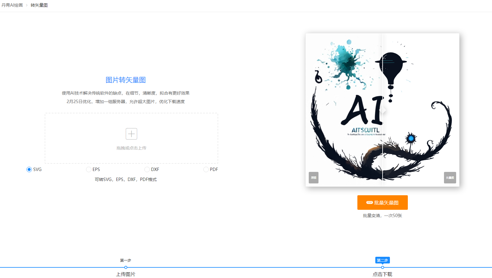 一、核心功能:一鍵轉(zhuǎn)換,多格式適配丹青AI的矢量圖轉(zhuǎn)換功能以全自動(dòng)化處理為核心,支持JPG、PNG等位圖格式在線轉(zhuǎn)換為SVG、EPS、DXF、PDF等矢量格式,滿足印刷、UI設(shè)計(jì)、動(dòng)畫制作等多元需求。其亮點(diǎn)包括: