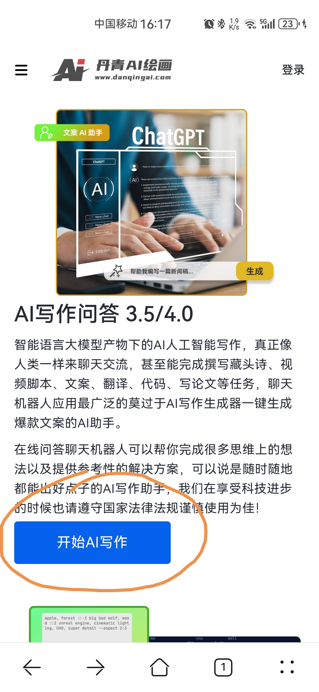具體使用方法首先打開(kāi)丹青AI網(wǎng)站點(diǎn)擊“AI寫(xiě)作”進(jìn)入