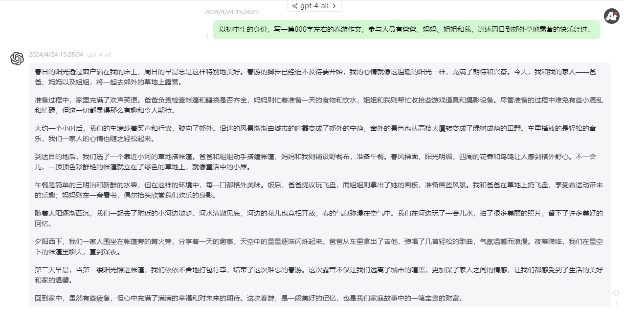 比如輸入我們的需求“以初中生的身份,寫一篇800字左右的春游作文,參與人員有爸爸、媽媽、姐姐和我,講述周日到郊外草地露營的快樂經(jīng)過。”智能AI寫作生成器則自動寫作如下內(nèi)容: